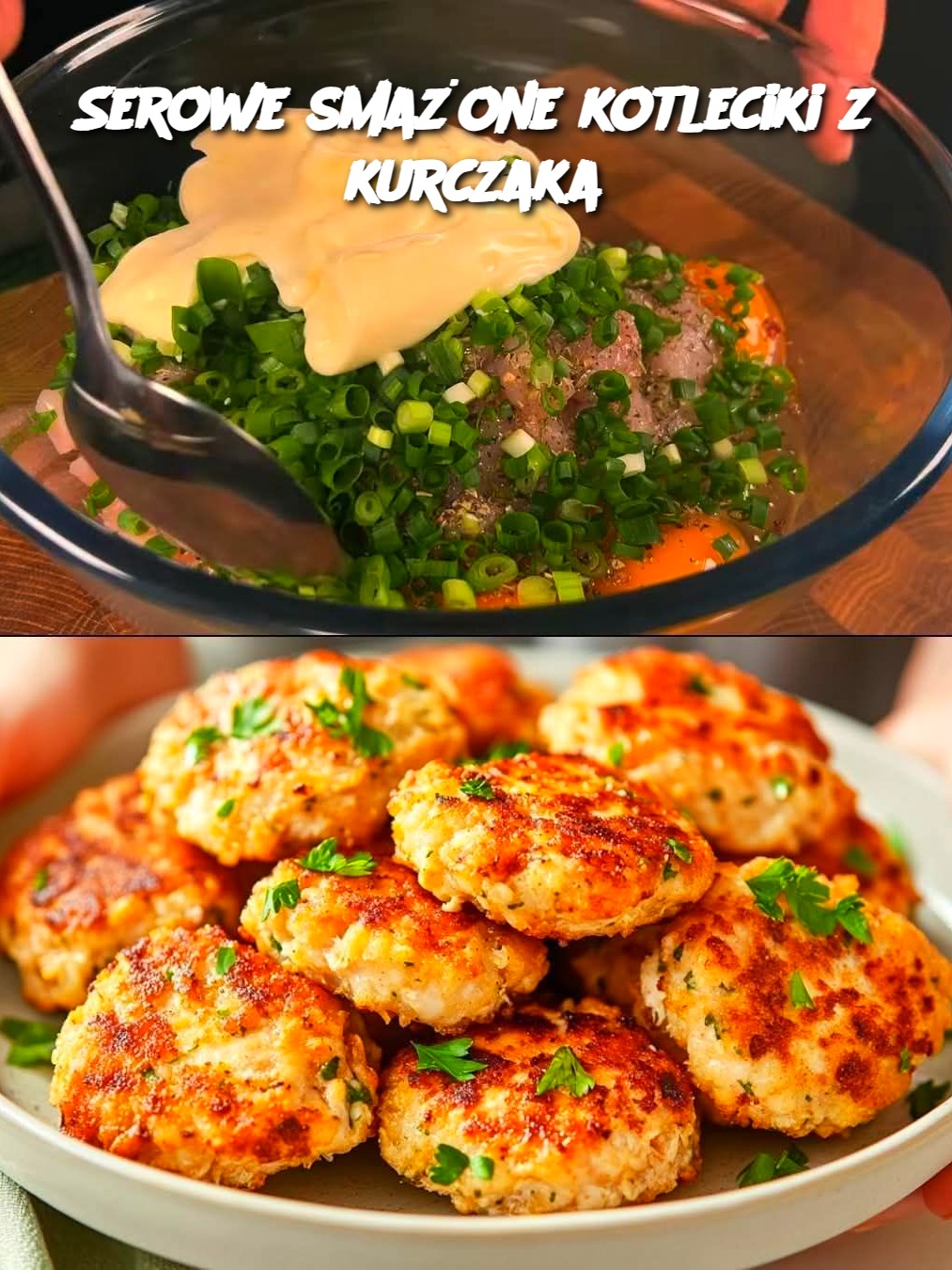 Składniki 4 filety z kurczaka, pokrojone w kostkę lub drobno posiekane 3 jajka 1 łyżeczka włoskich ziół 2 zielone cebulki, drobno posiekane 2 łyżki majonezu 200 g startego sera (mozzarella, cheddar lub mieszanka) 2 łyżki mąki sól i pieprz do smaku olej do smażenia Przepis jest kontynuowany na następnej stronie